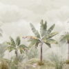 De dierenset bestaat uit een teddybeer, konijn, vos, olifant en andere vriendelijke wezens die zweven in de lucht op een grote, pastelkleurige ballon. De kleuren van het behang zijn delicaat en ingetogen, waardoor het perfect past bij diverse interieurs.