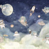 Fijne pastelkleuren en vriendelijke illustraties zorgen ervoor dat het fotobehang perfect past bij verschillende stijlen kinderinterieurs en warmte en vreugde brengt in de kamer van de kleintjes. Dankzij het kan het kind zijn verbeelding ontwikkelen, dromen van interstellaire reizen en de geheimen van het universum ontdekken.